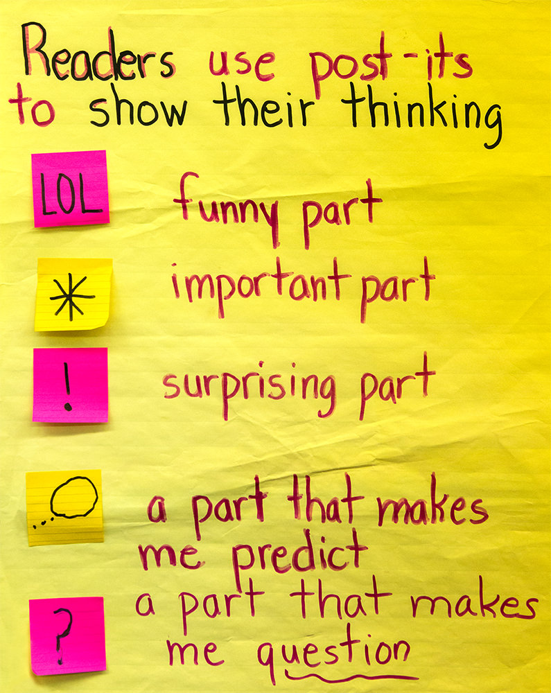 These are vitally important for supporting active reading. The small size of a post-it notes helps children learn to jot just the most important thing they are thinking. Or, they can code their thinking in a way that saves time yet allows them to process their thinking (for example, using a question mark when they are thinking of a question they would like to ask a character or the author). Additionally, when you conference with a child or when children work in partnerships, these post-its can work as springboards for conversations. The post it strategy is especially helpful with content specific vocabulary development. Students can mark key words that were challenging, interesting, or added to their understanding of the reading.
